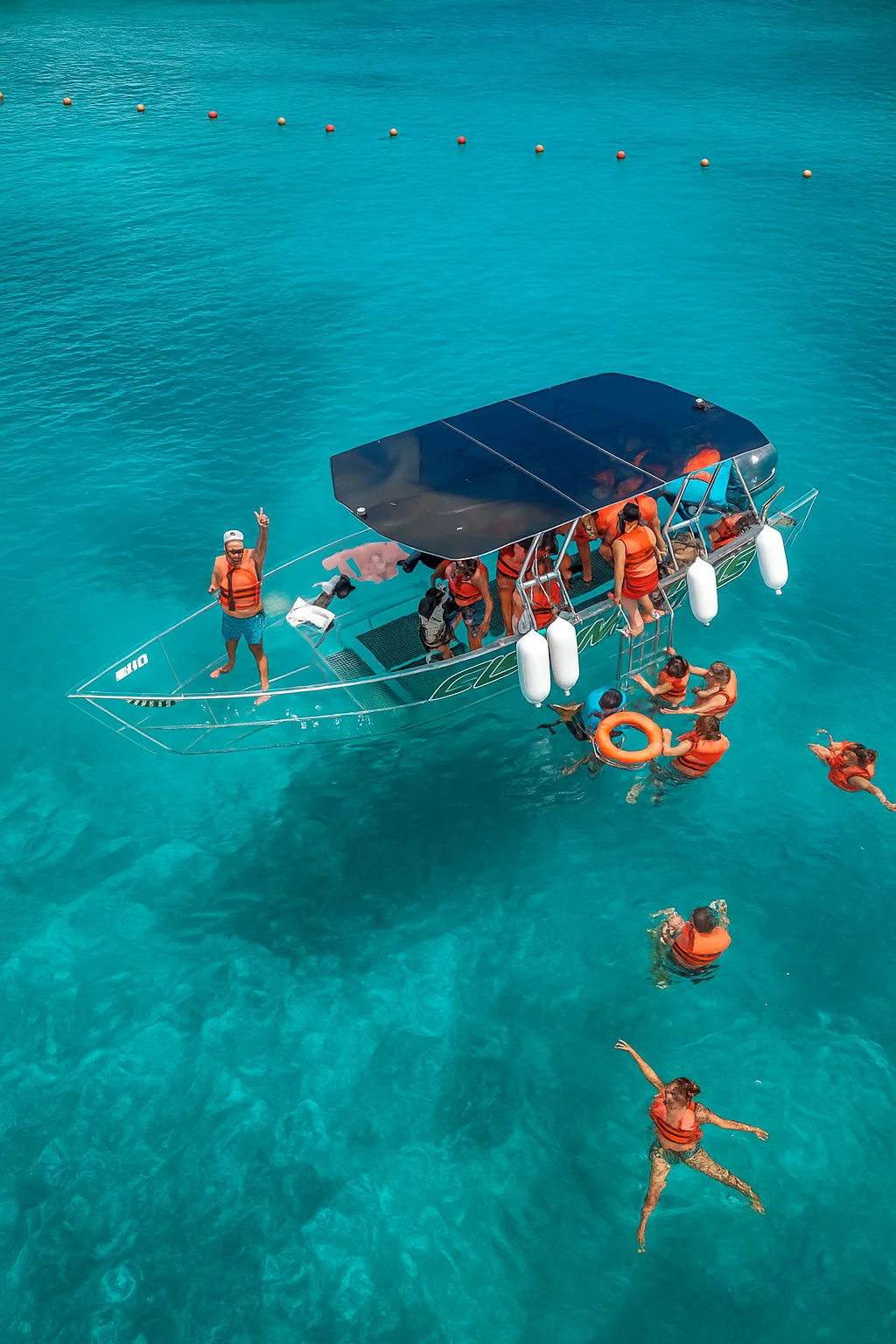 Nuestros tours "Todo Incluido" te recogen en tu hotel de Cancún o Riviera Maya, te llevan en van a Playa del Carmen, y allí te incluyen el ferry a Cozumel, donde te espera la embarcación de snorkel. Es la forma más fácil y coordinada de hacerlo en un día.